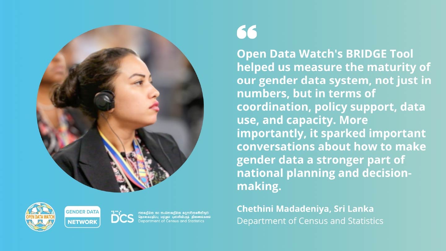 Around the same time, at the Department of Census and Statistics (DCS) in Sri Lanka, we were strengthening our focus on gender data. So, when the BRIDGE Tool, a data system maturity model for building responsive Investments in data for gender equality, developed by Data2X and Open Data Watch (ODW), was introduced through the GDN, the timing couldn’t have been better.
