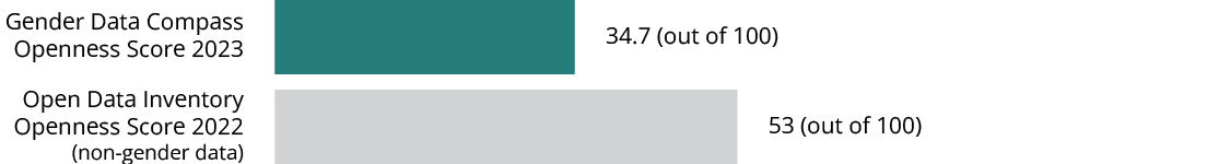 Although open formats and open data licensing are implemented relatively easily, even by countries with limited resources, the Compass’s findings indicate that less attention is given to openness of gender data than non-gender data. Figure 3 below compares the average openness score for the 185 countries in the Compass with the openness scores from the 2022 Open Data Inventory (ODIN) for non-gender data categories. Even accounting for small methodological differences, the 18-point gap between the openness of gender and non-gender data confirms that gender data are less accessible and usable than other types of data. Though the causes of discrepancy vary across countries, one trend that may account for the gap is that many countries only publish gender data in inconsistently published special reports that are often only available in PDF format. Until gender data are incorporated into mainstream data portals, the usability of gender data will continue to fall short and hamper use.